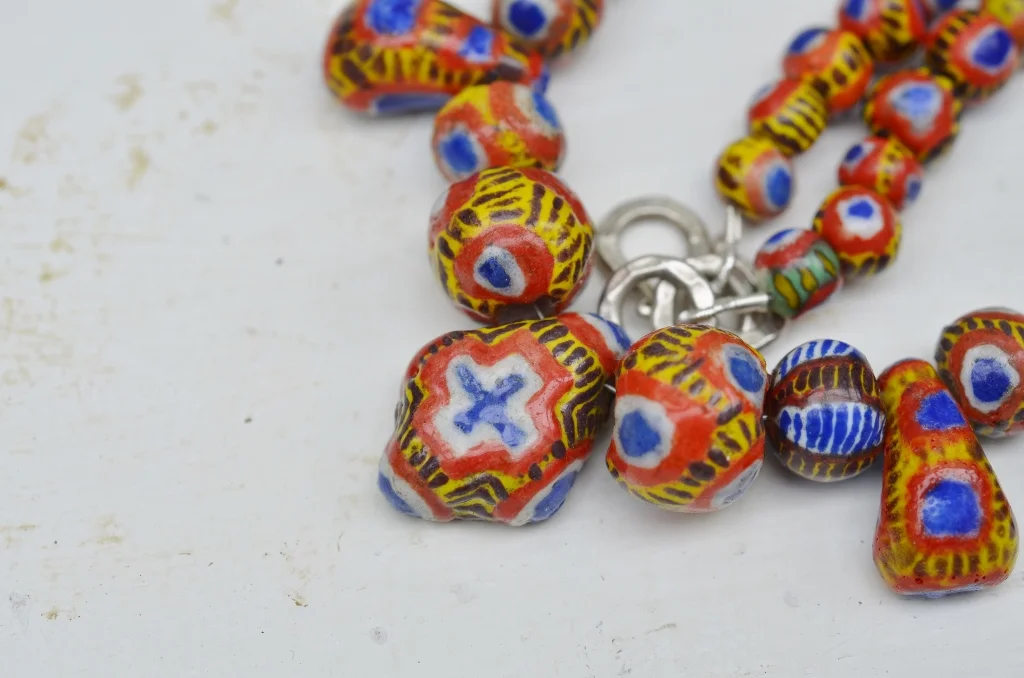 Traditional Kiffa beads were individually produced by hand, with a central core made out of various materials. This core was sometimes made from dark gray powdered glass and sometimes non-glass materials. Using a needle and spit, tiny portions of red or blue or yellow or white powdered glass were laboriously applied to the bead core. This was done over and over again until the beads were totally covered with this outer layer of powdered glass. The semi-finished beads were then "cooked" over outdoor open fires until the powdered glass fused.